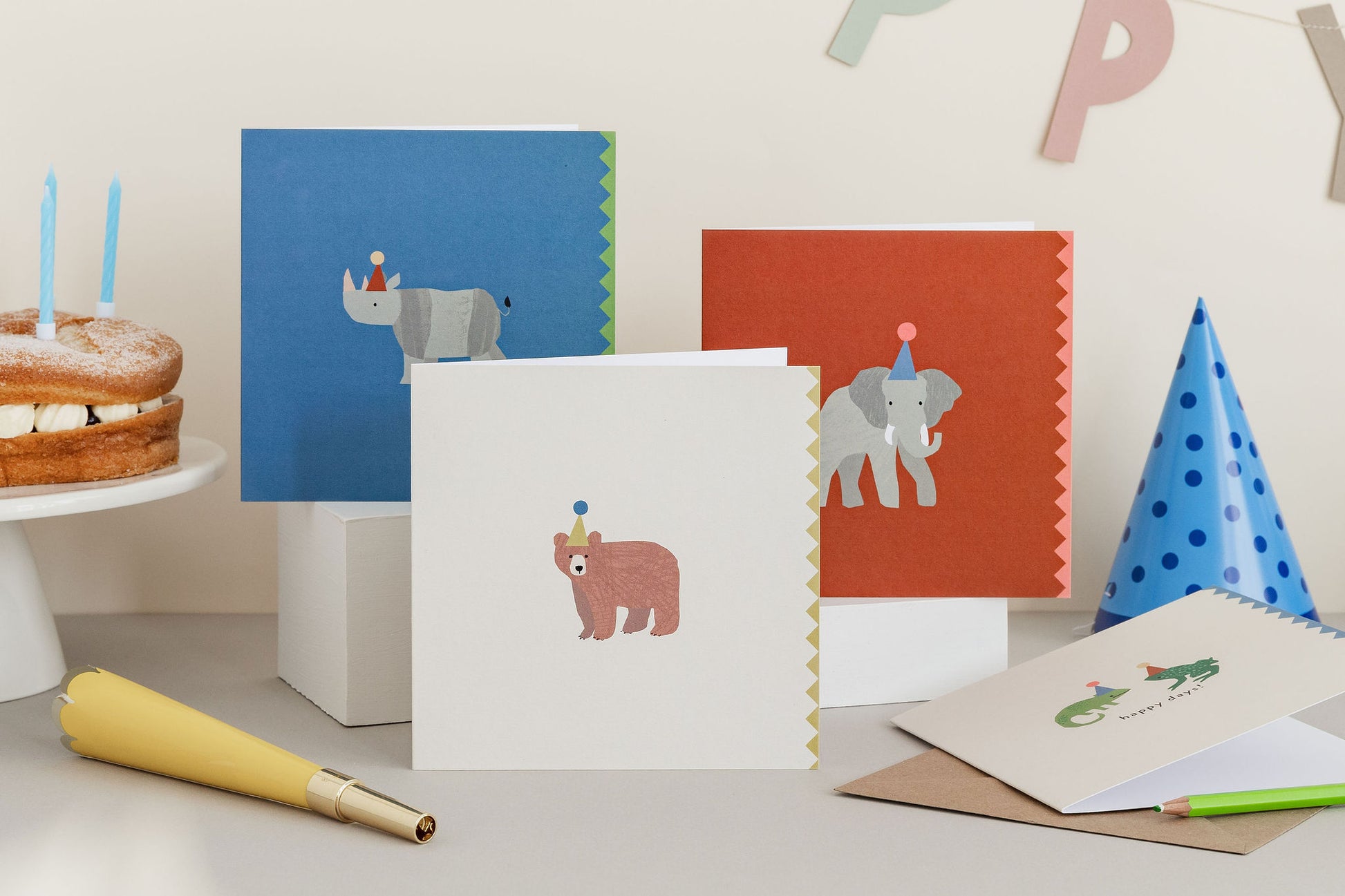 Celebrate in style with our Rhino Greeting Card from our Animal Adventures Collection! This square blue card features a cheerful rhino donning a party hat, adding a touch of fun to any occasion. Send it to a loved one and spread joy and happiness with our unique and playful design.