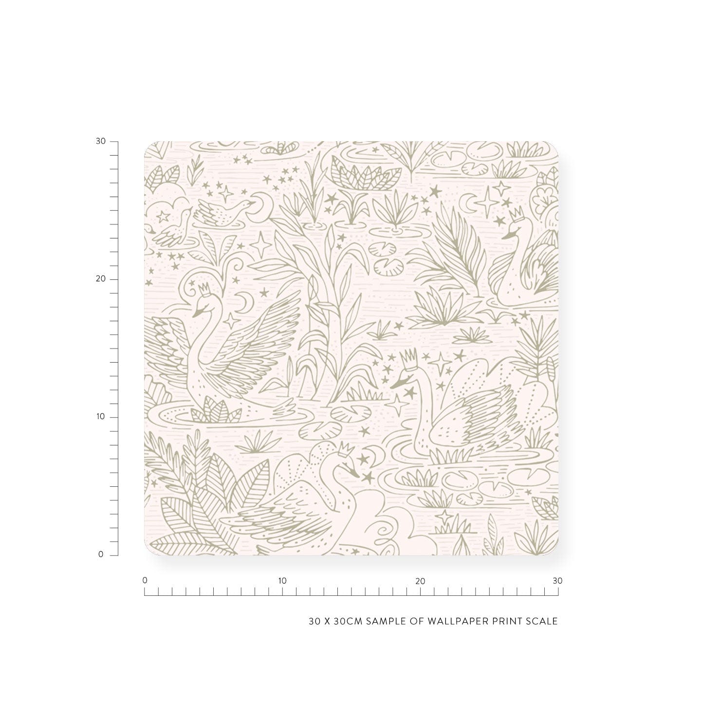 Transform your child's bedroom into a magical space with Minibeau's Swan Lake Sage wallpaper by Becca Barker. Let your little one's imagination soar as they admire the swans adorned with tiny crowns, gliding across a star-filled lake. Our talented artist, Bec, has created this graceful and detail-rich linear design, perfect for charming nurseries and rooms of all ages.