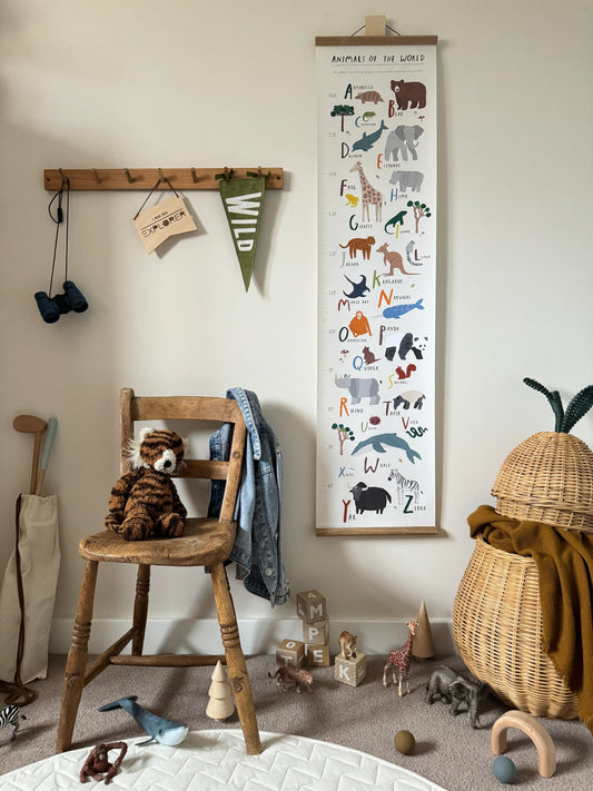 Our height charts are poly-cotton canvas topped with solid oak, fixed ends. They are printed with non toxic inks and are wipeable.
